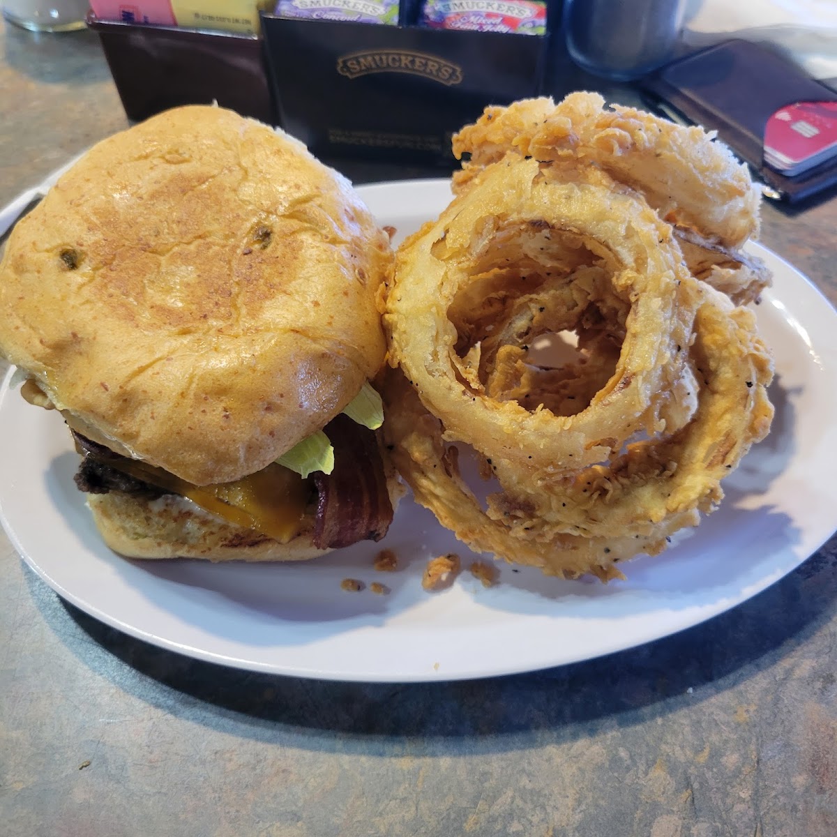 The onion rings are so good. The batter doesn’t fall off, even after being reheated for left overs. The atmosphere feels old and dated, but the food and service is good.